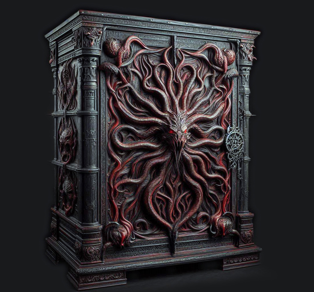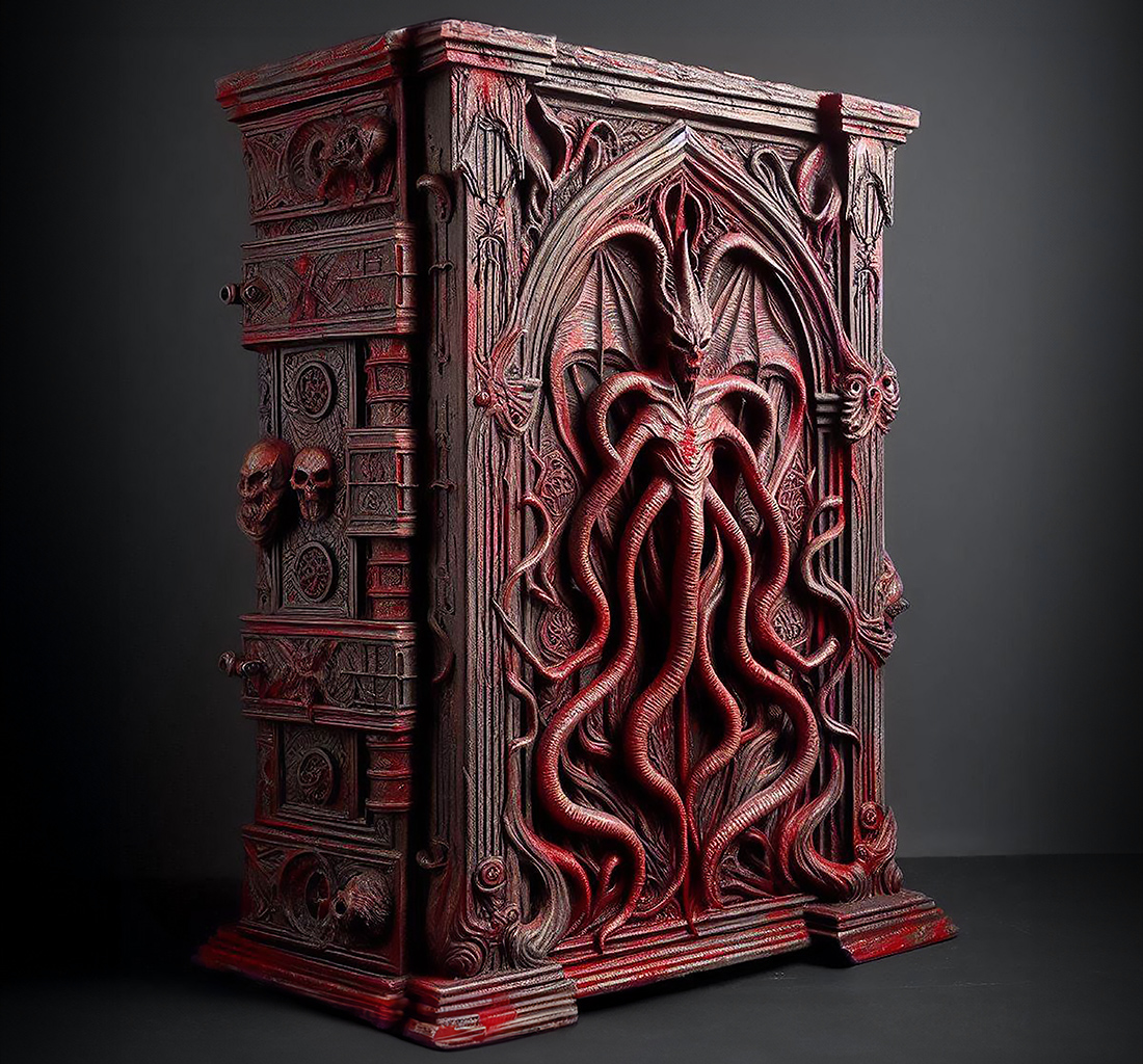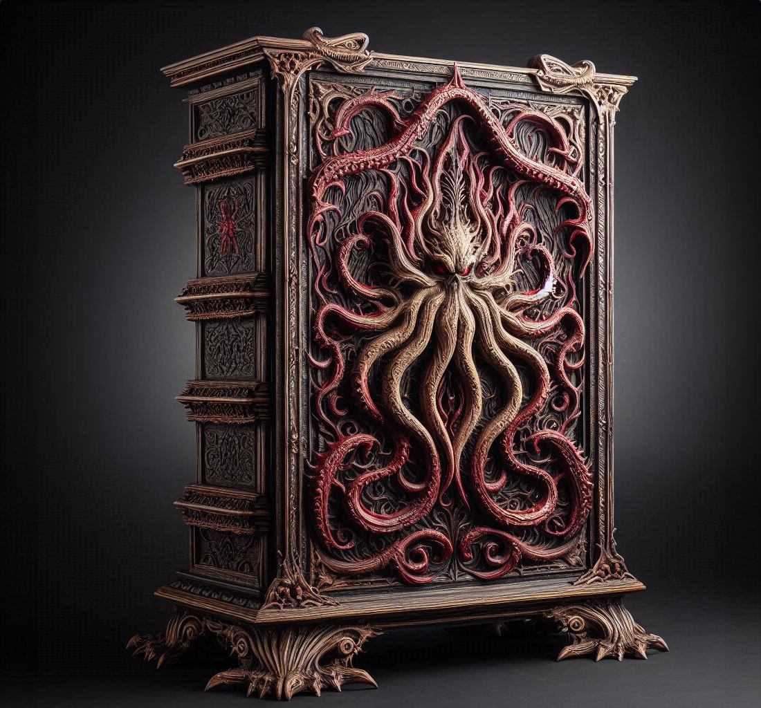 A masterpiece of dark craftsmanship, it's designed to resemble the fabled grimoire itself, with faux leather covers and ancient, weathered pages. It is adorned with sculpted tentacles that reach out as if beckoning you to explore the forbidden knowledge they hold. The wood is stained in deep, almost blood-red hues, and the intricate carvings give off an aura of ancient malevolence
